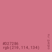 Цвет #D27286 в цветовой модели RGB обозначается тремя октетами (210, 114, 134) в десятичном формате и #D27286 в шестнадцатиричном (hex) формате, которые являются интенсивностью красного 210 (hex D2), интенсивность зелёного 114 (hex 72) и интенсивность синего 134 (hex 86).