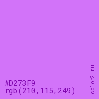 Цвет #D273F9 в цветовой модели RGB обозначается тремя октетами (210, 115, 249) в десятичном формате и #D273F9 в шестнадцатиричном (hex) формате, которые являются интенсивностью красного 210 (hex D2), интенсивность зелёного 115 (hex 73) и интенсивность синего 249 (hex F9).