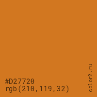 Цвет #D27720 в цветовой модели RGB обозначается тремя октетами (210, 119, 32) в десятичном формате и #D27720 в шестнадцатиричном (hex) формате, которые являются интенсивностью красного 210 (hex D2), интенсивность зелёного 119 (hex 77) и интенсивность синего 32 (hex 20).