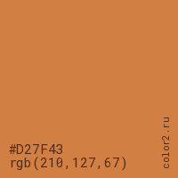 Цвет #D27F43 в цветовой модели RGB обозначается тремя октетами (210, 127, 67) в десятичном формате и #D27F43 в шестнадцатиричном (hex) формате, которые являются интенсивностью красного 210 (hex D2), интенсивность зелёного 127 (hex 7F) и интенсивность синего 67 (hex 43).
