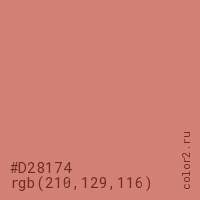 Цвет #D28174 в цветовой модели RGB обозначается тремя октетами (210, 129, 116) в десятичном формате и #D28174 в шестнадцатиричном (hex) формате, которые являются интенсивностью красного 210 (hex D2), интенсивность зелёного 129 (hex 81) и интенсивность синего 116 (hex 74).