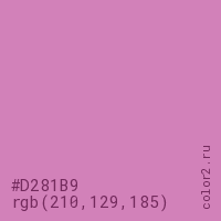 Цвет #D281B9 в цветовой модели RGB обозначается тремя октетами (210, 129, 185) в десятичном формате и #D281B9 в шестнадцатиричном (hex) формате, которые являются интенсивностью красного 210 (hex D2), интенсивность зелёного 129 (hex 81) и интенсивность синего 185 (hex B9).
