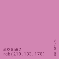 Цвет #D285B2 в цветовой модели RGB обозначается тремя октетами (210, 133, 178) в десятичном формате и #D285B2 в шестнадцатиричном (hex) формате, которые являются интенсивностью красного 210 (hex D2), интенсивность зелёного 133 (hex 85) и интенсивность синего 178 (hex B2).