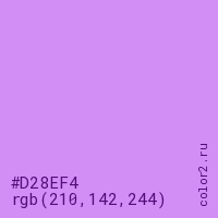 Цвет #D28EF4 в цветовой модели RGB обозначается тремя октетами (210, 142, 244) в десятичном формате и #D28EF4 в шестнадцатиричном (hex) формате, которые являются интенсивностью красного 210 (hex D2), интенсивность зелёного 142 (hex 8E) и интенсивность синего 244 (hex F4).