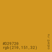 Цвет #D29720 в цветовой модели RGB обозначается тремя октетами (210, 151, 32) в десятичном формате и #D29720 в шестнадцатиричном (hex) формате, которые являются интенсивностью красного 210 (hex D2), интенсивность зелёного 151 (hex 97) и интенсивность синего 32 (hex 20).