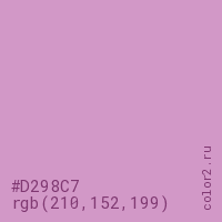 Цвет #D298C7 в цветовой модели RGB обозначается тремя октетами (210, 152, 199) в десятичном формате и #D298C7 в шестнадцатиричном (hex) формате, которые являются интенсивностью красного 210 (hex D2), интенсивность зелёного 152 (hex 98) и интенсивность синего 199 (hex C7).