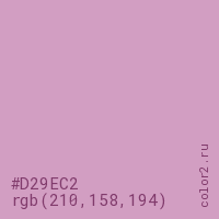 Цвет #D29EC2 в цветовой модели RGB обозначается тремя октетами (210, 158, 194) в десятичном формате и #D29EC2 в шестнадцатиричном (hex) формате, которые являются интенсивностью красного 210 (hex D2), интенсивность зелёного 158 (hex 9E) и интенсивность синего 194 (hex C2).