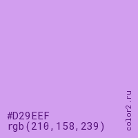 Цвет #D29EEF в цветовой модели RGB обозначается тремя октетами (210, 158, 239) в десятичном формате и #D29EEF в шестнадцатиричном (hex) формате, которые являются интенсивностью красного 210 (hex D2), интенсивность зелёного 158 (hex 9E) и интенсивность синего 239 (hex EF).