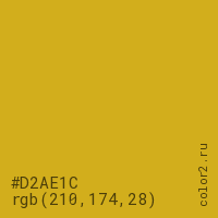 Цвет #D2AE1C в цветовой модели RGB обозначается тремя октетами (210, 174, 28) в десятичном формате и #D2AE1C в шестнадцатиричном (hex) формате, которые являются интенсивностью красного 210 (hex D2), интенсивность зелёного 174 (hex AE) и интенсивность синего 28 (hex 1C).