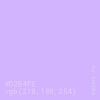 Цвет #D2B4FE в цветовой модели RGB обозначается тремя октетами (210, 180, 254) в десятичном формате и #D2B4FE в шестнадцатиричном (hex) формате, которые являются интенсивностью красного 210 (hex D2), интенсивность зелёного 180 (hex B4) и интенсивность синего 254 (hex FE).