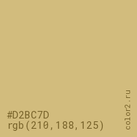 Цвет #D2BC7D в цветовой модели RGB обозначается тремя октетами (210, 188, 125) в десятичном формате и #D2BC7D в шестнадцатиричном (hex) формате, которые являются интенсивностью красного 210 (hex D2), интенсивность зелёного 188 (hex BC) и интенсивность синего 125 (hex 7D).