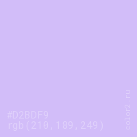Цвет #D2BDF9 в цветовой модели RGB обозначается тремя октетами (210, 189, 249) в десятичном формате и #D2BDF9 в шестнадцатиричном (hex) формате, которые являются интенсивностью красного 210 (hex D2), интенсивность зелёного 189 (hex BD) и интенсивность синего 249 (hex F9).