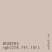 Цвет #D2BFB5 в цветовой модели RGB обозначается тремя октетами (210, 191, 181) в десятичном формате и #D2BFB5 в шестнадцатиричном (hex) формате, которые являются интенсивностью красного 210 (hex D2), интенсивность зелёного 191 (hex BF) и интенсивность синего 181 (hex B5).