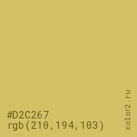 Цвет #D2C267 в цветовой модели RGB обозначается тремя октетами (210, 194, 103) в десятичном формате и #D2C267 в шестнадцатиричном (hex) формате, которые являются интенсивностью красного 210 (hex D2), интенсивность зелёного 194 (hex C2) и интенсивность синего 103 (hex 67).