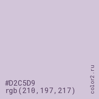 Цвет #D2C5D9 в цветовой модели RGB обозначается тремя октетами (210, 197, 217) в десятичном формате и #D2C5D9 в шестнадцатиричном (hex) формате, которые являются интенсивностью красного 210 (hex D2), интенсивность зелёного 197 (hex C5) и интенсивность синего 217 (hex D9).