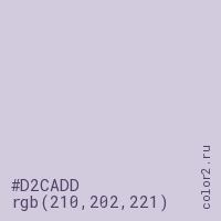 Цвет #D2CADD в цветовой модели RGB обозначается тремя октетами (210, 202, 221) в десятичном формате и #D2CADD в шестнадцатиричном (hex) формате, которые являются интенсивностью красного 210 (hex D2), интенсивность зелёного 202 (hex CA) и интенсивность синего 221 (hex DD).