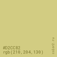 Цвет #D2CC82 в цветовой модели RGB обозначается тремя октетами (210, 204, 130) в десятичном формате и #D2CC82 в шестнадцатиричном (hex) формате, которые являются интенсивностью красного 210 (hex D2), интенсивность зелёного 204 (hex CC) и интенсивность синего 130 (hex 82).