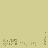 Цвет #D2CE92 в цветовой модели RGB обозначается тремя октетами (210, 206, 146) в десятичном формате и #D2CE92 в шестнадцатиричном (hex) формате, которые являются интенсивностью красного 210 (hex D2), интенсивность зелёного 206 (hex CE) и интенсивность синего 146 (hex 92).