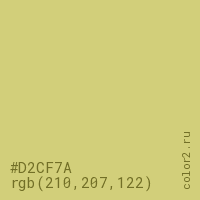 Цвет #D2CF7A в цветовой модели RGB обозначается тремя октетами (210, 207, 122) в десятичном формате и #D2CF7A в шестнадцатиричном (hex) формате, которые являются интенсивностью красного 210 (hex D2), интенсивность зелёного 207 (hex CF) и интенсивность синего 122 (hex 7A).
