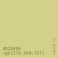 Цвет #D2D089 в цветовой модели RGB обозначается тремя октетами (210, 208, 137) в десятичном формате и #D2D089 в шестнадцатиричном (hex) формате, которые являются интенсивностью красного 210 (hex D2), интенсивность зелёного 208 (hex D0) и интенсивность синего 137 (hex 89).