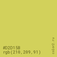 Цвет #D2D15B в цветовой модели RGB обозначается тремя октетами (210, 209, 91) в десятичном формате и #D2D15B в шестнадцатиричном (hex) формате, которые являются интенсивностью красного 210 (hex D2), интенсивность зелёного 209 (hex D1) и интенсивность синего 91 (hex 5B).