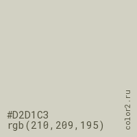 Цвет #D2D1C3 в цветовой модели RGB обозначается тремя октетами (210, 209, 195) в десятичном формате и #D2D1C3 в шестнадцатиричном (hex) формате, которые являются интенсивностью красного 210 (hex D2), интенсивность зелёного 209 (hex D1) и интенсивность синего 195 (hex C3).