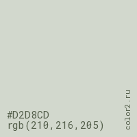 Цвет #D2D8CD в цветовой модели RGB обозначается тремя октетами (210, 216, 205) в десятичном формате и #D2D8CD в шестнадцатиричном (hex) формате, которые являются интенсивностью красного 210 (hex D2), интенсивность зелёного 216 (hex D8) и интенсивность синего 205 (hex CD).