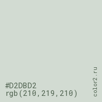 Цвет #D2DBD2 в цветовой модели RGB обозначается тремя октетами (210, 219, 210) в десятичном формате и #D2DBD2 в шестнадцатиричном (hex) формате, которые являются интенсивностью красного 210 (hex D2), интенсивность зелёного 219 (hex DB) и интенсивность синего 210 (hex D2).