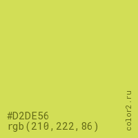 Цвет #D2DE56 в цветовой модели RGB обозначается тремя октетами (210, 222, 86) в десятичном формате и #D2DE56 в шестнадцатиричном (hex) формате, которые являются интенсивностью красного 210 (hex D2), интенсивность зелёного 222 (hex DE) и интенсивность синего 86 (hex 56).