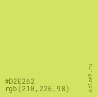 Цвет #D2E262 в цветовой модели RGB обозначается тремя октетами (210, 226, 98) в десятичном формате и #D2E262 в шестнадцатиричном (hex) формате, которые являются интенсивностью красного 210 (hex D2), интенсивность зелёного 226 (hex E2) и интенсивность синего 98 (hex 62).