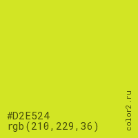 Цвет #D2E524 в цветовой модели RGB обозначается тремя октетами (210, 229, 36) в десятичном формате и #D2E524 в шестнадцатиричном (hex) формате, которые являются интенсивностью красного 210 (hex D2), интенсивность зелёного 229 (hex E5) и интенсивность синего 36 (hex 24).