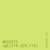 Цвет #D2E571 в цветовой модели RGB обозначается тремя октетами (210, 229, 113) в десятичном формате и #D2E571 в шестнадцатиричном (hex) формате, которые являются интенсивностью красного 210 (hex D2), интенсивность зелёного 229 (hex E5) и интенсивность синего 113 (hex 71).