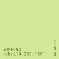 Цвет #D2E99C в цветовой модели RGB обозначается тремя октетами (210, 233, 156) в десятичном формате и #D2E99C в шестнадцатиричном (hex) формате, которые являются интенсивностью красного 210 (hex D2), интенсивность зелёного 233 (hex E9) и интенсивность синего 156 (hex 9C).