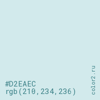 Цвет #D2EAEC в цветовой модели RGB обозначается тремя октетами (210, 234, 236) в десятичном формате и #D2EAEC в шестнадцатиричном (hex) формате, которые являются интенсивностью красного 210 (hex D2), интенсивность зелёного 234 (hex EA) и интенсивность синего 236 (hex EC).