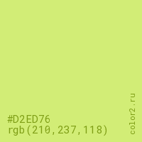 Цвет #D2ED76 в цветовой модели RGB обозначается тремя октетами (210, 237, 118) в десятичном формате и #D2ED76 в шестнадцатиричном (hex) формате, которые являются интенсивностью красного 210 (hex D2), интенсивность зелёного 237 (hex ED) и интенсивность синего 118 (hex 76).