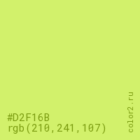 Цвет #D2F16B в цветовой модели RGB обозначается тремя октетами (210, 241, 107) в десятичном формате и #D2F16B в шестнадцатиричном (hex) формате, которые являются интенсивностью красного 210 (hex D2), интенсивность зелёного 241 (hex F1) и интенсивность синего 107 (hex 6B).