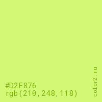 Цвет #D2F876 в цветовой модели RGB обозначается тремя октетами (210, 248, 118) в десятичном формате и #D2F876 в шестнадцатиричном (hex) формате, которые являются интенсивностью красного 210 (hex D2), интенсивность зелёного 248 (hex F8) и интенсивность синего 118 (hex 76).