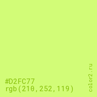 Цвет #D2FC77 в цветовой модели RGB обозначается тремя октетами (210, 252, 119) в десятичном формате и #D2FC77 в шестнадцатиричном (hex) формате, которые являются интенсивностью красного 210 (hex D2), интенсивность зелёного 252 (hex FC) и интенсивность синего 119 (hex 77).