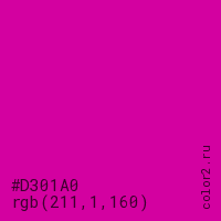 Цвет #D301A0 в цветовой модели RGB обозначается тремя октетами (211, 1, 160) в десятичном формате и #D301A0 в шестнадцатиричном (hex) формате, которые являются интенсивностью красного 211 (hex D3), интенсивность зелёного 1 (hex 01) и интенсивность синего 160 (hex A0).