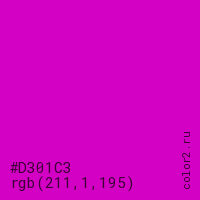 Цвет #D301C3 в цветовой модели RGB обозначается тремя октетами (211, 1, 195) в десятичном формате и #D301C3 в шестнадцатиричном (hex) формате, которые являются интенсивностью красного 211 (hex D3), интенсивность зелёного 1 (hex 01) и интенсивность синего 195 (hex C3).