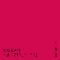 Цвет #D3094F в цветовой модели RGB обозначается тремя октетами (211, 9, 79) в десятичном формате и #D3094F в шестнадцатиричном (hex) формате, которые являются интенсивностью красного 211 (hex D3), интенсивность зелёного 9 (hex 09) и интенсивность синего 79 (hex 4F).