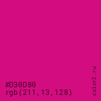 Цвет #D30D80 в цветовой модели RGB обозначается тремя октетами (211, 13, 128) в десятичном формате и #D30D80 в шестнадцатиричном (hex) формате, которые являются интенсивностью красного 211 (hex D3), интенсивность зелёного 13 (hex 0D) и интенсивность синего 128 (hex 80).