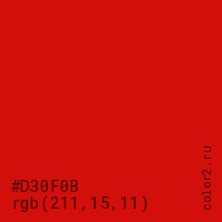 Цвет #D30F0B в цветовой модели RGB обозначается тремя октетами (211, 15, 11) в десятичном формате и #D30F0B в шестнадцатиричном (hex) формате, которые являются интенсивностью красного 211 (hex D3), интенсивность зелёного 15 (hex 0F) и интенсивность синего 11 (hex 0B).