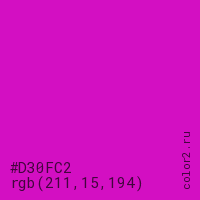Цвет #D30FC2 в цветовой модели RGB обозначается тремя октетами (211, 15, 194) в десятичном формате и #D30FC2 в шестнадцатиричном (hex) формате, которые являются интенсивностью красного 211 (hex D3), интенсивность зелёного 15 (hex 0F) и интенсивность синего 194 (hex C2).