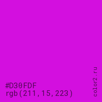 Цвет #D30FDF в цветовой модели RGB обозначается тремя октетами (211, 15, 223) в десятичном формате и #D30FDF в шестнадцатиричном (hex) формате, которые являются интенсивностью красного 211 (hex D3), интенсивность зелёного 15 (hex 0F) и интенсивность синего 223 (hex DF).