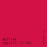 Цвет #D31146 в цветовой модели RGB обозначается тремя октетами (211, 17, 70) в десятичном формате и #D31146 в шестнадцатиричном (hex) формате, которые являются интенсивностью красного 211 (hex D3), интенсивность зелёного 17 (hex 11) и интенсивность синего 70 (hex 46).