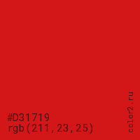Цвет #D31719 в цветовой модели RGB обозначается тремя октетами (211, 23, 25) в десятичном формате и #D31719 в шестнадцатиричном (hex) формате, которые являются интенсивностью красного 211 (hex D3), интенсивность зелёного 23 (hex 17) и интенсивность синего 25 (hex 19).