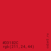 Цвет #D3182C в цветовой модели RGB обозначается тремя октетами (211, 24, 44) в десятичном формате и #D3182C в шестнадцатиричном (hex) формате, которые являются интенсивностью красного 211 (hex D3), интенсивность зелёного 24 (hex 18) и интенсивность синего 44 (hex 2C).
