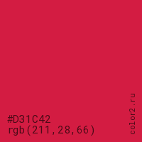Цвет #D31C42 в цветовой модели RGB обозначается тремя октетами (211, 28, 66) в десятичном формате и #D31C42 в шестнадцатиричном (hex) формате, которые являются интенсивностью красного 211 (hex D3), интенсивность зелёного 28 (hex 1C) и интенсивность синего 66 (hex 42).