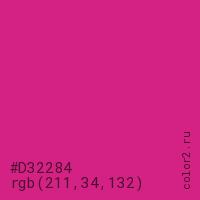 Цвет #D32284 в цветовой модели RGB обозначается тремя октетами (211, 34, 132) в десятичном формате и #D32284 в шестнадцатиричном (hex) формате, которые являются интенсивностью красного 211 (hex D3), интенсивность зелёного 34 (hex 22) и интенсивность синего 132 (hex 84).